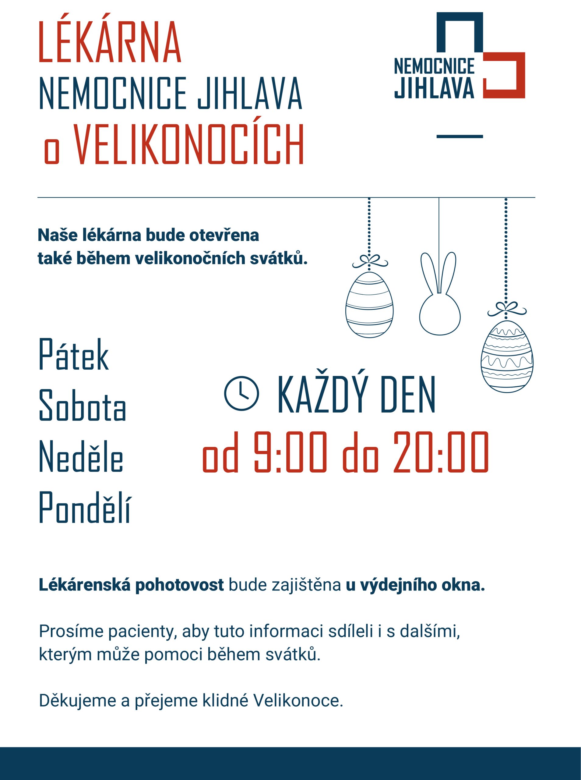 Otevírací doba nemocniční lékárny od 3.4 do 6. 4. 20226 – víkend mezi Velkým pátkem a Velikonočním pondělím.