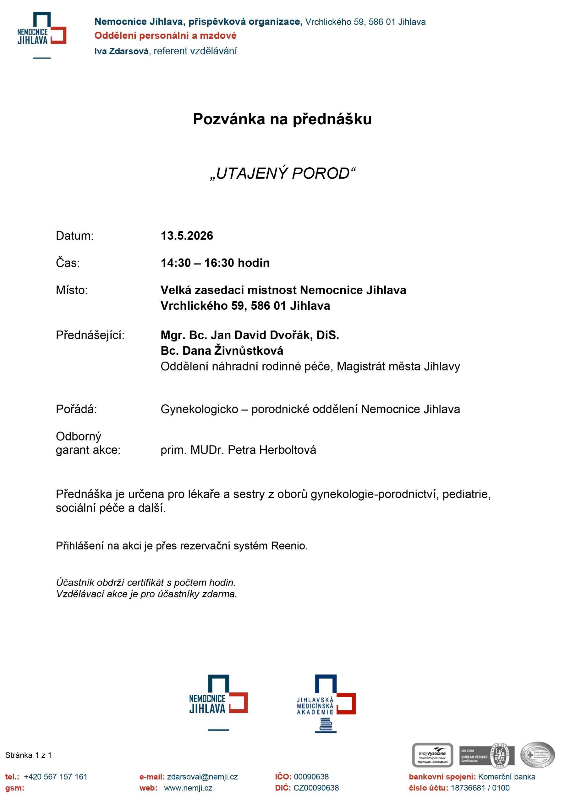 rádi bychom Vás pozvali na přednášku „Utajený porod“, která se koná ve středu 13.5.2026 od 14:30 hod. ve Velké zasedací místnosti nemocnice Jihlava.